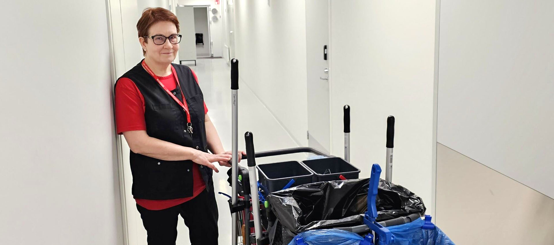 Työskentelen laitoshuoltajana Saaristokadun päätoimipaikassa. Työtehtäviini kuuluu siivoaminen ja puhtaanapito koko kiinteistössä, keskusvaraston tiloista hallinnon tiloihin. Osa tiloista, kuten vessat ja pukuhuoneet, siivotaan päivittäin, kun taas moni tiloista siivotaan viikoittain tiettynä päivänä. Lisäksi on kuukausittaisia töitä, kuten pölyjen poistoa ja lattiakaivojen putsausta.