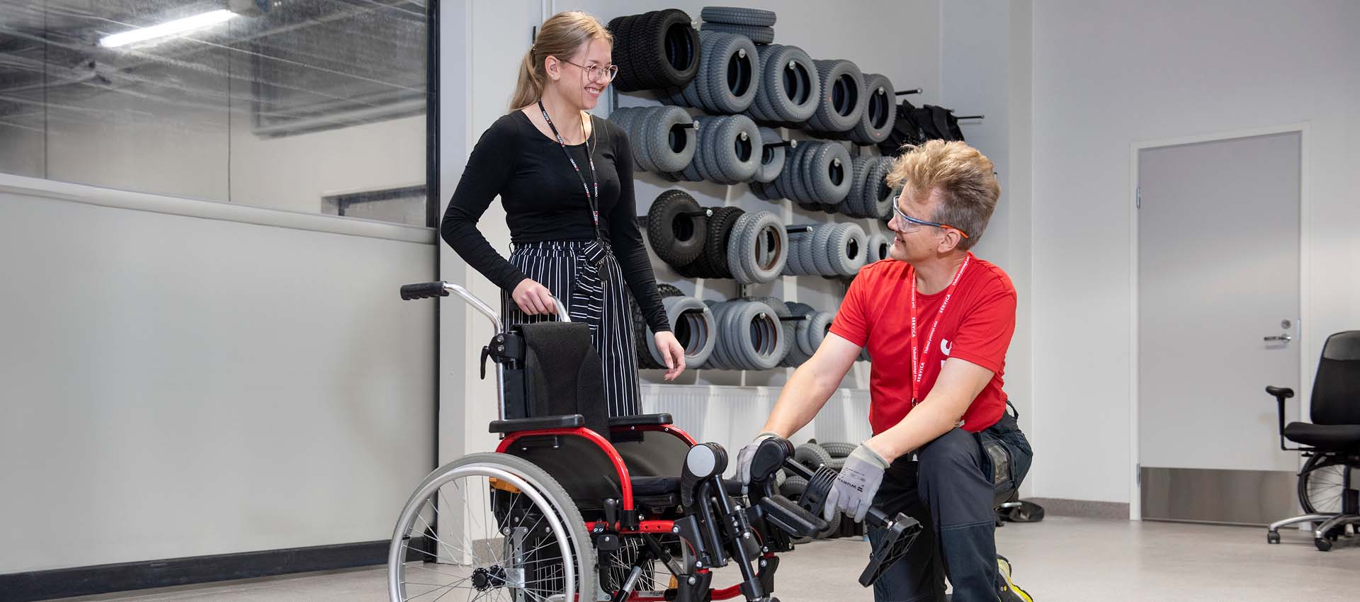Servican apuvälinehuollon työntekijä työntää pyörätuolia, rollaattoria ja tuoleja huollettavaksi.