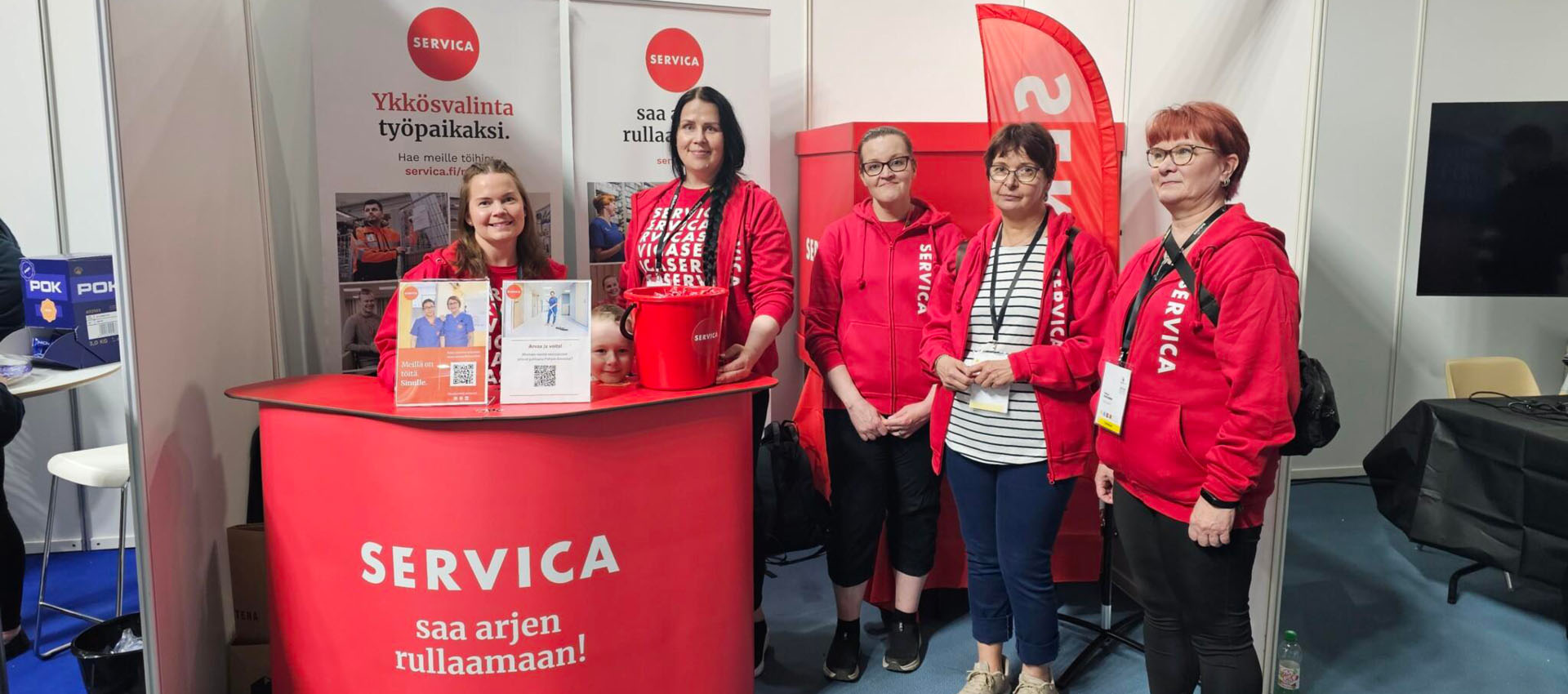 Lisäksi Servicalla oli oma ständi Kuopio-hallin tapahtumatorilla. Kävijöitä oli runsaasti kaikkina päivinä. Tiistaina ständillä oli mukana Evgeniia, joka voitti pronssia puhdistuspalvelun kisoissa viisi vuotta sitten ja työskentelee nyt Servicalla Uppo-Nallen päiväkodissa.