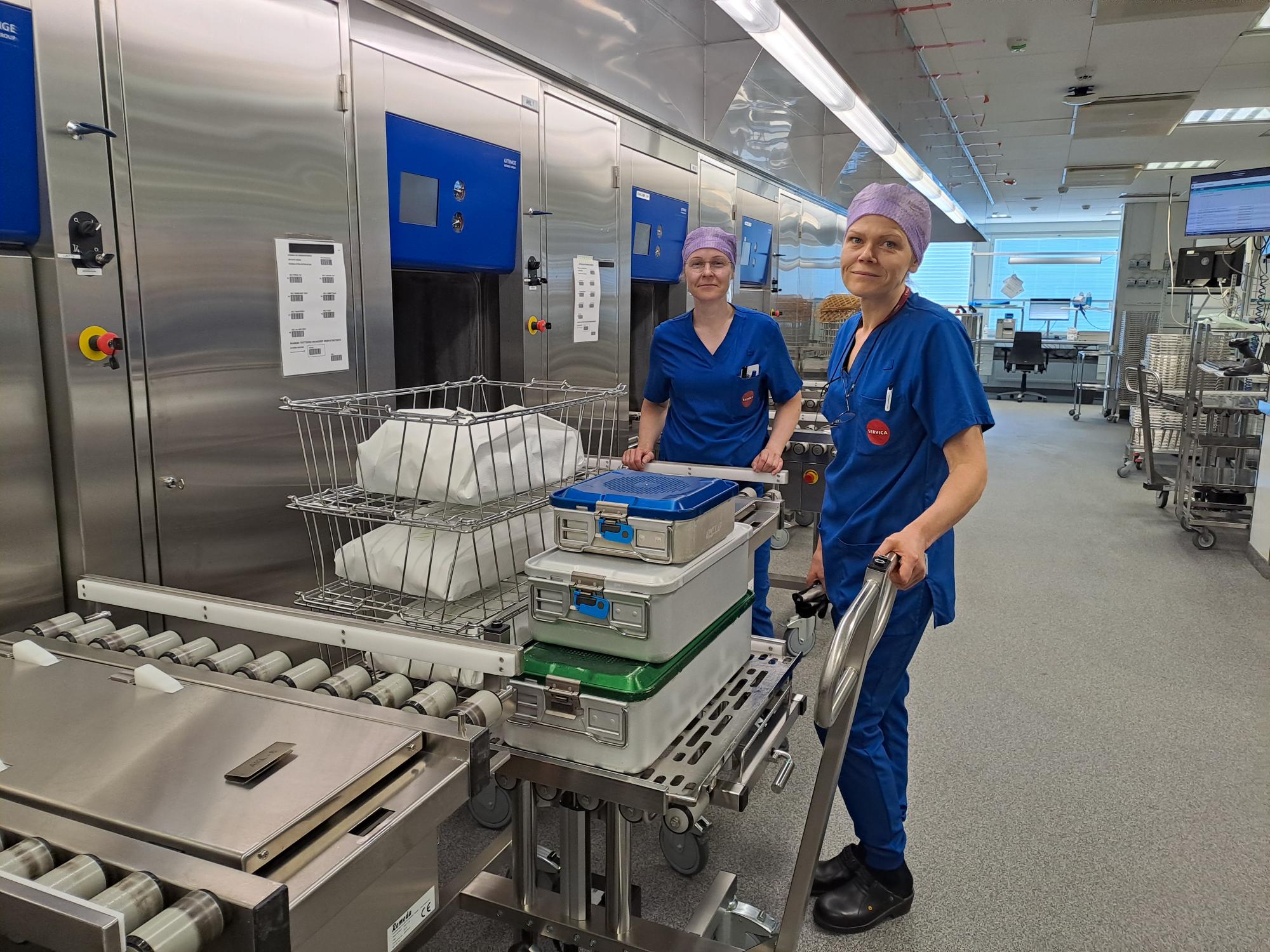 Höyryautoklaavien validointeja tekemässä Indical Oy:n validointiteknikko Nina Hyppönen ja Servican välinehuoltaja Eija Hyvärinen.